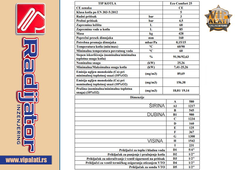 Kotlovi na pelet Eco Comfort 25 kW Radijator Inženjering razvijeni su sa ciljem da „Radijator Inženjering“ ponudi tržištu kotao koji je po svojim mehaničkim i termičkim osobinama izrazito namenjen biomasi kao gorivu. Pri normalnim režimima temperatura dimnih gasova na izlazu je oko 170°C.