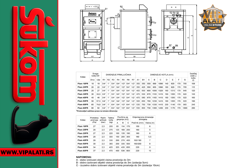 Toplovodni kotlovi na čvrsto komadno gorivo tip Šukoplam PR 18-80kW u suštini predstavljaju modifikaciju kotlova tip Šukoplam R 18-80 kW. Ova modifikacija se ogleda u ugradnji posebnog ventilatora za sagorevanje na donjim vratima kotla. Na ovaj način kotao radi na tzv. veštačku promaju tj. glavni izvor vazduha za sagorevanje postaje ventilator a ne dimnjak. Ugradnjom ventilatora postiže se bolje sagorevanje goriva kao i bolje održavanje zadate temperature u kotlu u željenim granicama. Ovo fino održavanje zadate temperature vode je vrlo bitno u brojnim industrijskim procesima, te to ove kotlove čini odličnim izborom za procesnu industriju. Takođe, zbog ventilatora za sagorevanje kotao može bez problema da radi i uparen sa dimnjacima koji po svojim karakteristikama (prečnik i visina) ne bi dali željenu vuču kod kotla koji bi radio na tzv. prirodnu promaju.
